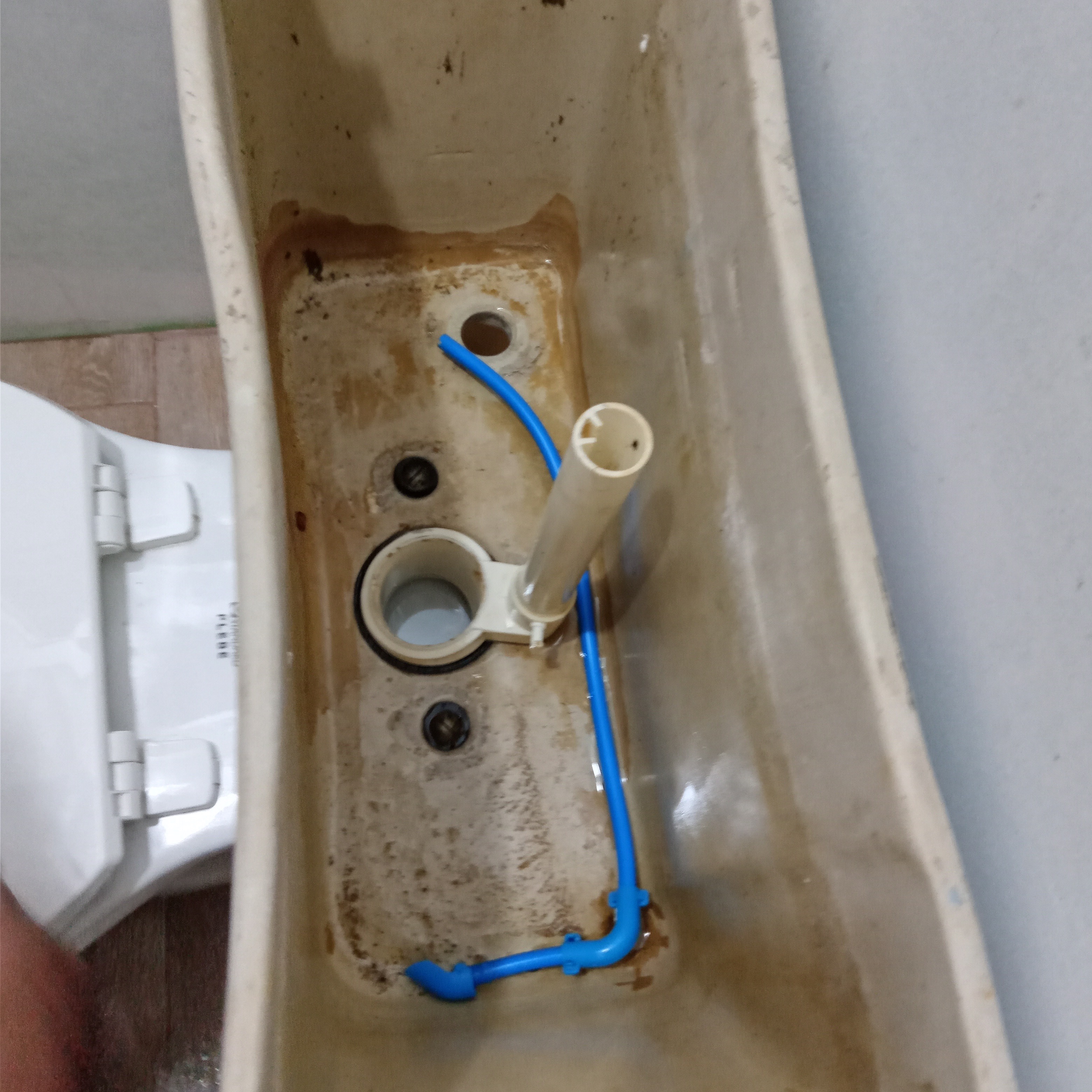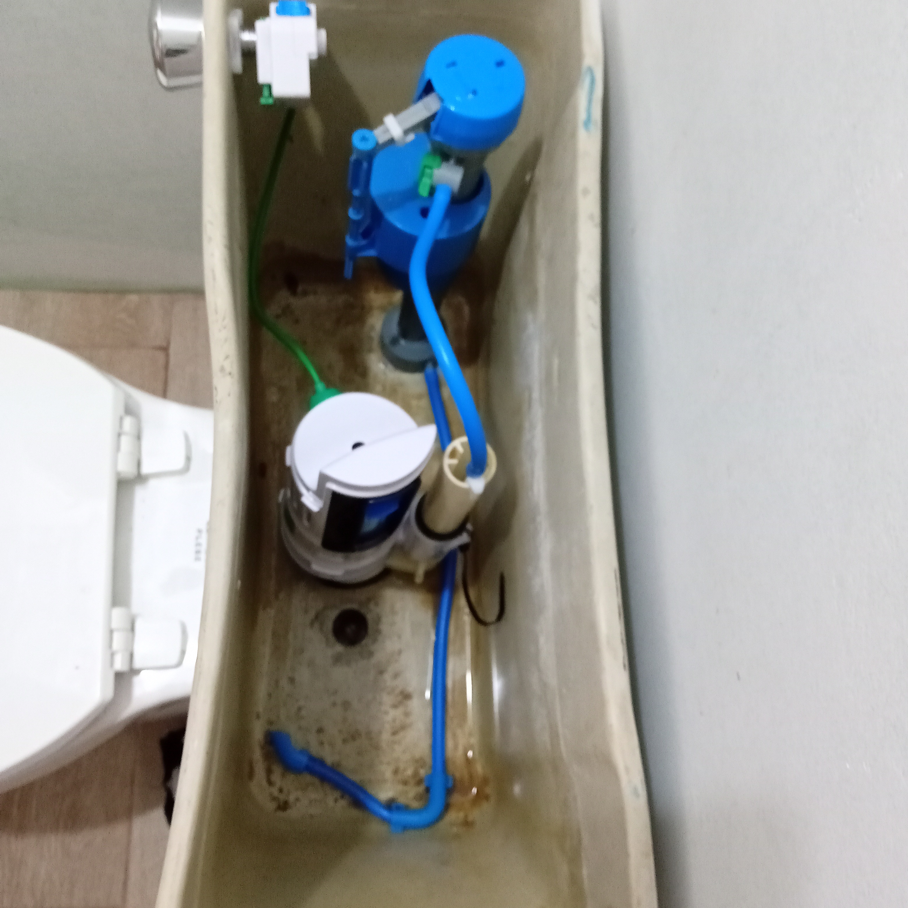 So finally, after all that cleaning on our recycled toilet, we still had a problem with high water consumption. So, we temporarily decided to place a 2-liter soda bottle inside the tank filled with water (you can also use sand or gravel). The filled bottles displace the water, so less water is used with each flush.